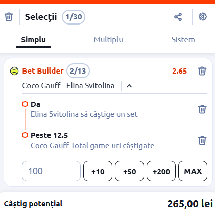 | Gauff – Svitolina | 10:00 | Svitolina ia minim un set & Gauff câștigă peste 12.5 game-uri | 2.65 |