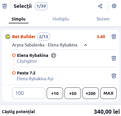 | Sabalenka – Rybakina | 10:30 | Rybakina servește peste 7.5 ași & Rybakina câștigă | 3.40 |