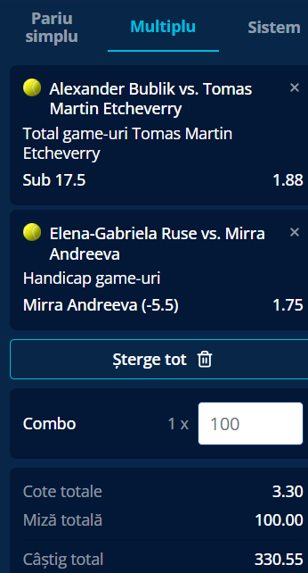 De cealaltă parte, Tomas Etcheverry, aflat în afara top 50, nu are rezultate prea încurajatoare pe hard. Anul trecut nu a ajuns mai departe de sferturile de finală la niciun turneu de pe această suprafață. În primul tur de la Australian Open a disputat set decisiv în fața sârbului Kecmanovic. În schimb, în a doua rundă a trecut în minimum de seturi de britanicul Arthur Fery, venit din calificări. Ne îndoim că Bublik va ceda al doilea set în acest an unui jucător care nu are ca suprafață preferată hardul. Chiar dacă sud-americanul va câștiga un set, opțiunea noastră conform căreia Etcheverry va obține cel mult 17 game-uri în meci poate fi în continuare „verde”.