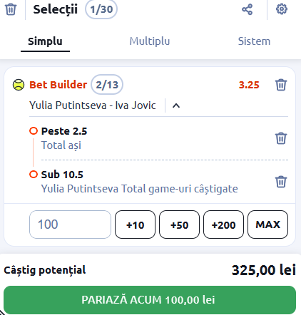 | Yulia Putintseva – Iva Jovic | 4:00 | peste 2.5 ași & Jovic câștigă sub 10.5 game-uri | 3.25 |