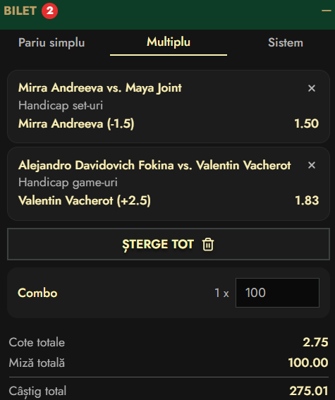 | Fokina – Vacherot | 11:30 | Fokina (+2.5 game-uri handicap) | 1.83 |