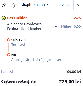 | Fokina – Humbert | 10:00 | nu câștigă ambii jucători set & sub 12.5 ași | 2.25 |