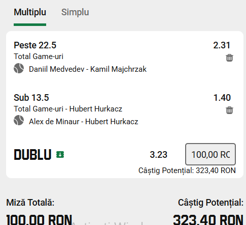 | Medvedev – Majchrzak | 12:00 | peste 22.5 game-uri | 2.31 |