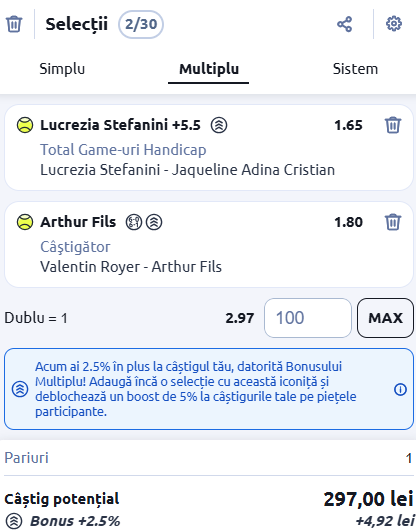 Biletul zilei tenis din 3 februarie 2026 de la Betano cu o cotă totală de 2.97
