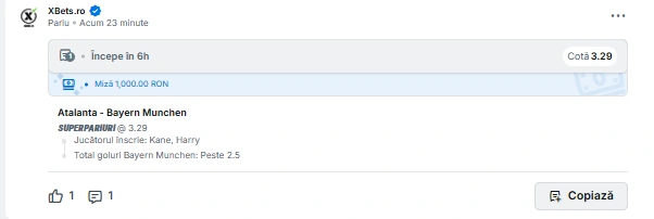 | Atalanta vs Bayern Munchen | peste 2,5 goluri & Harry Kane marchează | 3.30 |