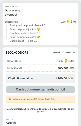 | Galatasaray vs Liverpool | peste 9,5 șuturi pe poartă, Osimhen sutează, Hugo Ekitike sutează | 3.10 |